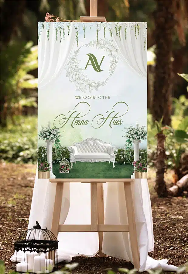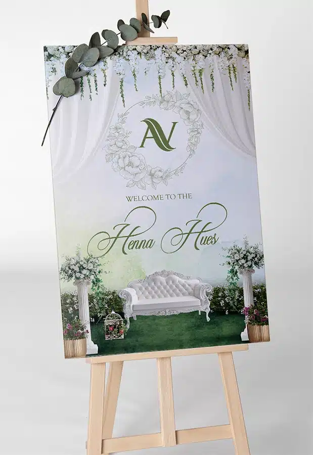 Enhance your mehndi celebration with natural elegance using our Floral Henna Art Mehndi Standee. Designed with delicate floral patterns blended seamlessly with traditional henna artwork, this standee creates a soft, artistic, and festive ambiance. Personalize it with the couple’s names, event date, and a welcoming message to make it truly special. Ideal for mehndi ceremonies, wedding entrances, and photo corners, this standee adds beauty, charm, and cultural warmth to your celebration.