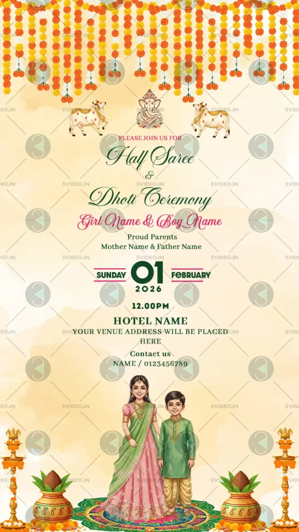Celebrate the beautiful cultural milestone of the Half Saree and Dhoti Ceremony with our elegantly designed invitation cards and animated video invites. Featuring traditional motifs, vibrant colors, and festive elements, these invitations perfectly reflect the significance of this special occasion. Customize the name, ceremony details, venue, family message, music, and RSVP information to create a memorable invite. Available as image cards and engaging video invitations for easy digital sharing or print-ready use.