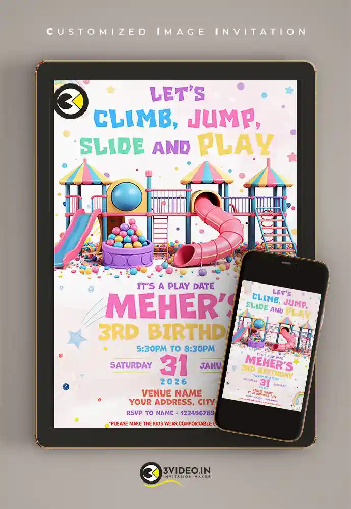After placing your order, simply share your child’s name, age, event date, time, venue, and photo (optional). Your playground birthday invitation card will be customized using the same design style, graphics, and fonts shown in the sample to maintain a bright and playful look.