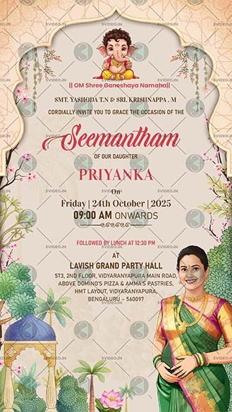 Celebrate the sacred tradition of Seemantham with our beautifully designed invitation card. Crafted with elegance and cultural essence, this card perfectly reflects the joy of welcoming a new life and honoring the mother-to-be. Personalize it with names, dates, and ceremony details to make it truly special. Ideal for digital sharing or printing, our Seemantham Invitation Card helps you invite loved ones with grace and traditional charm.